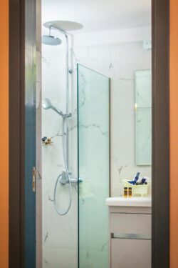 Upstairs, our newly renovated bedrooms open to views of the Aegean Sea, perfect for unwinding as the sun sets over Ixia beach.